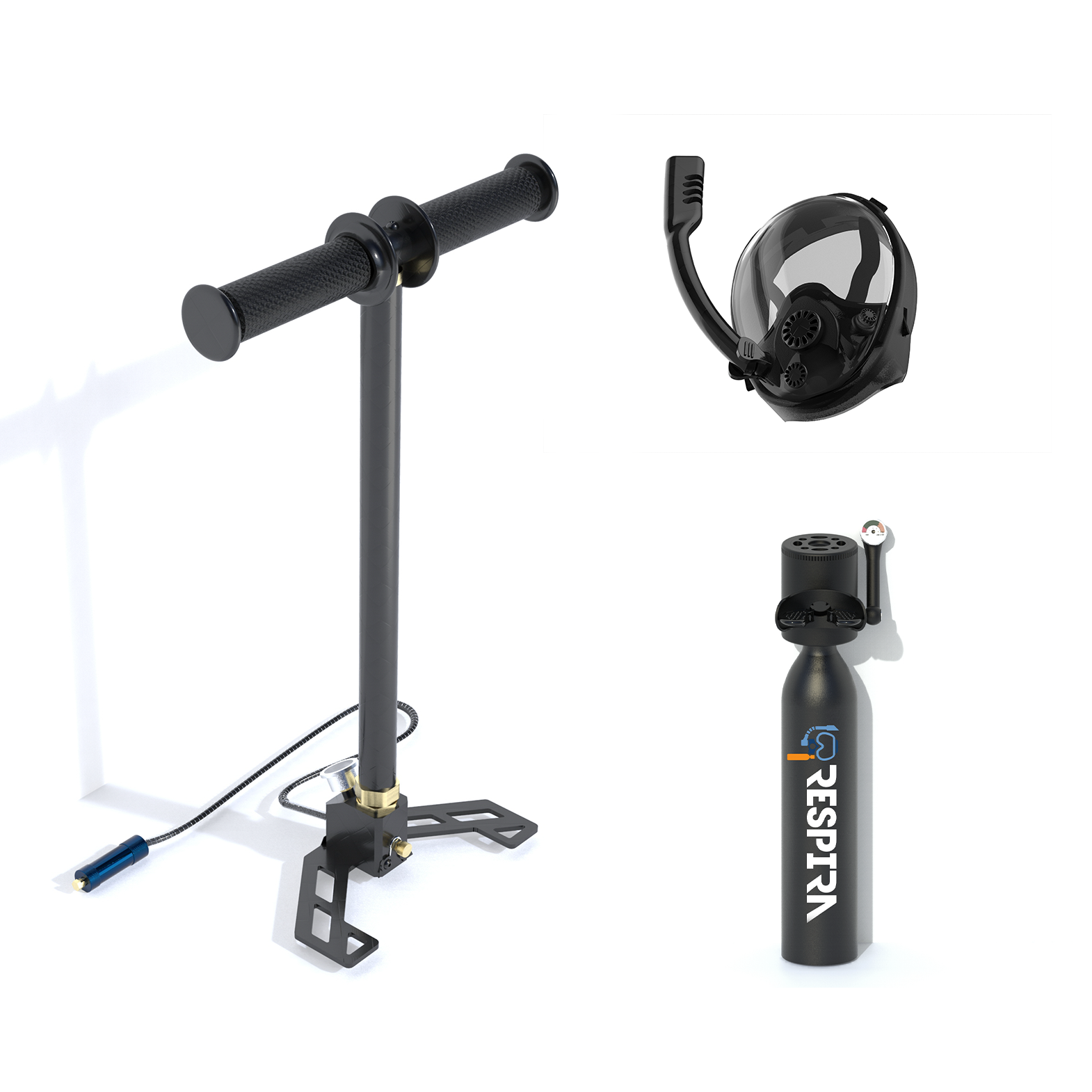 Refill your Respira Tank anytime and anywhere with the Respira Hand Pump. This manual pump operates without any power source. Simply connect it to your Respira Tank for a quick recharge, allowing you to resume your underwater adventures in minutes. Its foldable and lightweight design ensures easy portability. The Respira Hand Pump includes all necessary attachments and spare filters.